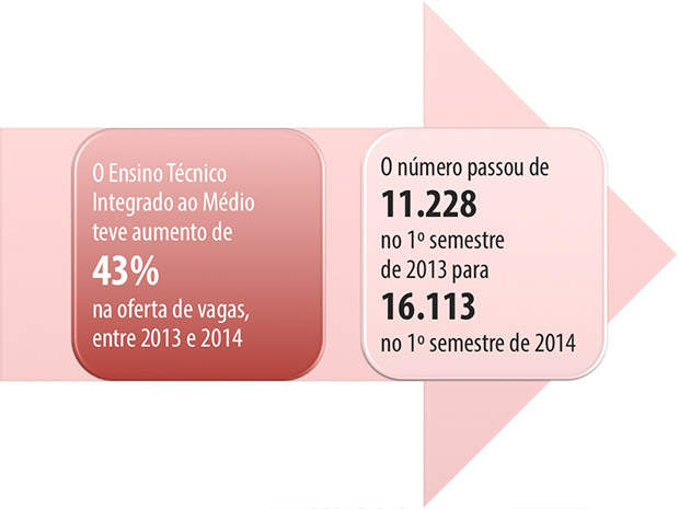 O Vestibulinho oferece 16.113 vagas para o Ensino Técnico Integrado ao Médio. No mesmo período do ano passado, foram 11.228, um crescimento de 43%. Desse total, 2.366 vagas são destinadas às escolas estaduais, por