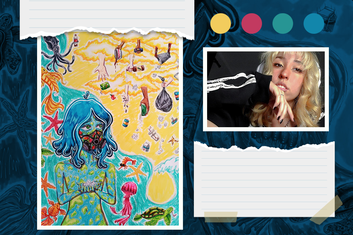 A estudante ao lado de sua obra, o desenho “Último Suspiro”, um dos vencedores do desafio | Foto: Bruna Nakamura