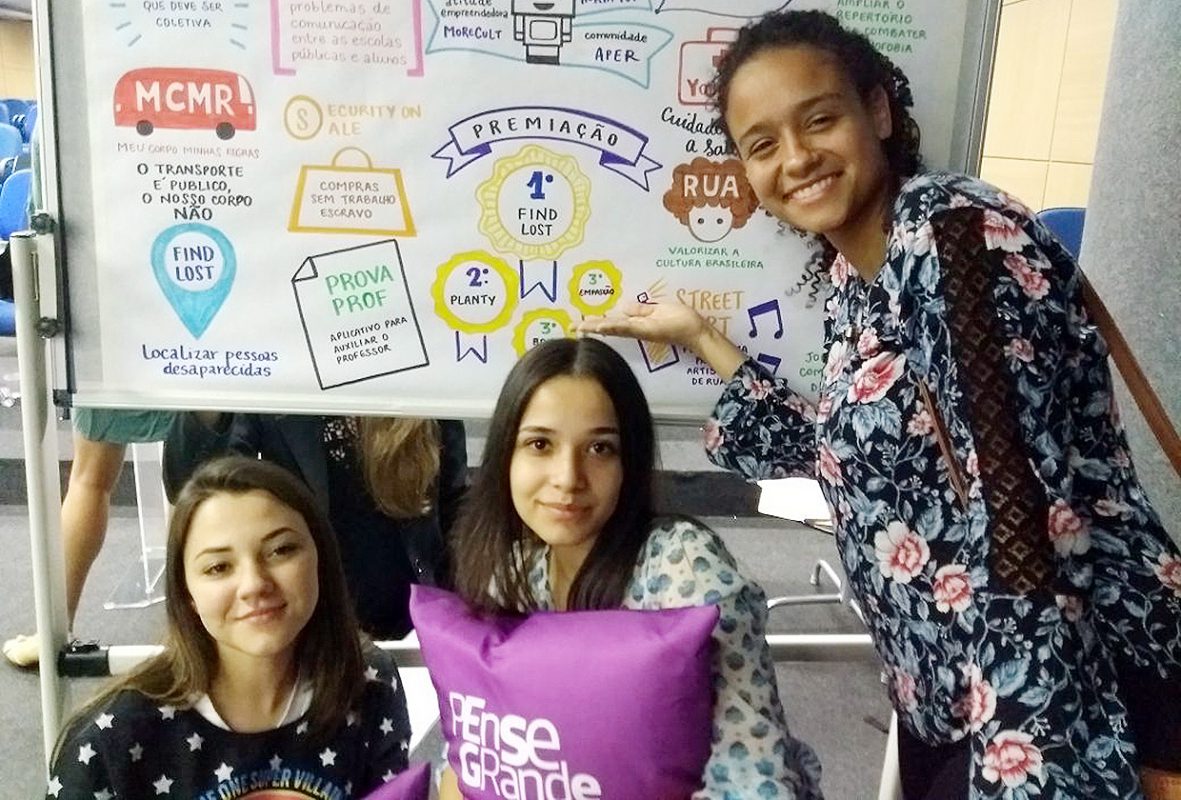 Um ano depois, a ideia começou a ser desenvolvida sob a forma de um aplicativo durante as oficinas do programa Pense Grande 2017 e conquistou o primeiro lugar entre os 60 projetos que participaram da iniciativa. Promovido pela Fundação Telefônica, em parceria com a rede global de empreendedores Impact Hub, o programa tem como objetivo estimular ações de empreendedorismo social entre jovens de escolas públicas.