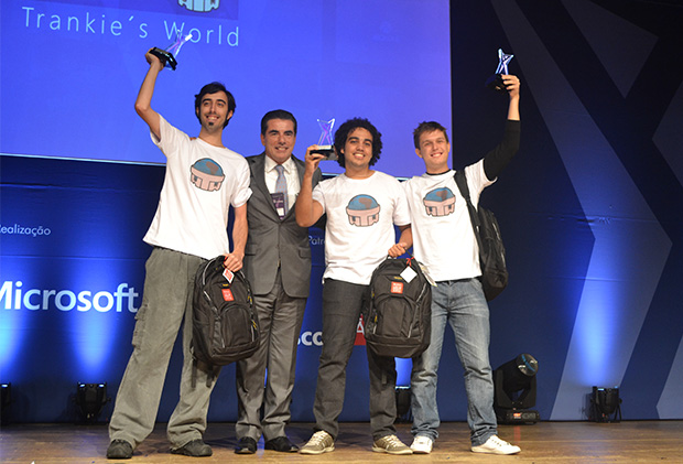 Danilo Bezerra (centro) segura o troféu durante entrega do prêmio da etapa nacional da Imagine Cup – Foto: Signum Game Studio