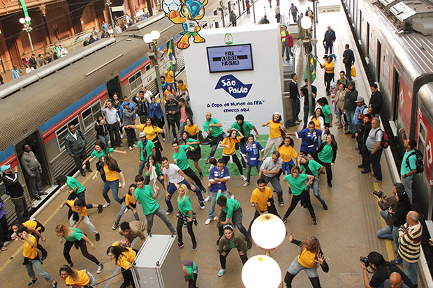 Os passageiros que desembarcaram na Estação da Luz nesta quarta-feira, 12, tiveram uma surpresa: durante 2 minutos, 140 alunos da Escola Técnica Estadual (Etec) de Artes, da Capital, dançaram entre as plataformas e nos mezaninos para comemorar a contagem regressiva para a Copa do Mundo de 2014.