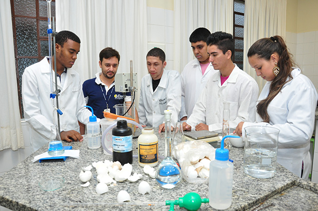 Estudantes do curso técnico em Química trabalham no projeto que reutiliza as cascas de ovos – Foto: Divulgação