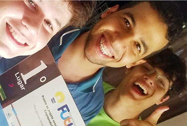 Alunos comemoram conquista do prêmio com o orientador do projeto, Everton Estevão (centro)