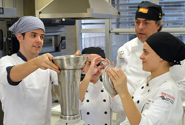 Fred Samora (atrás, à direita) orienta alunos na preparação da receita do gelato italiano – Foto: Divulgação