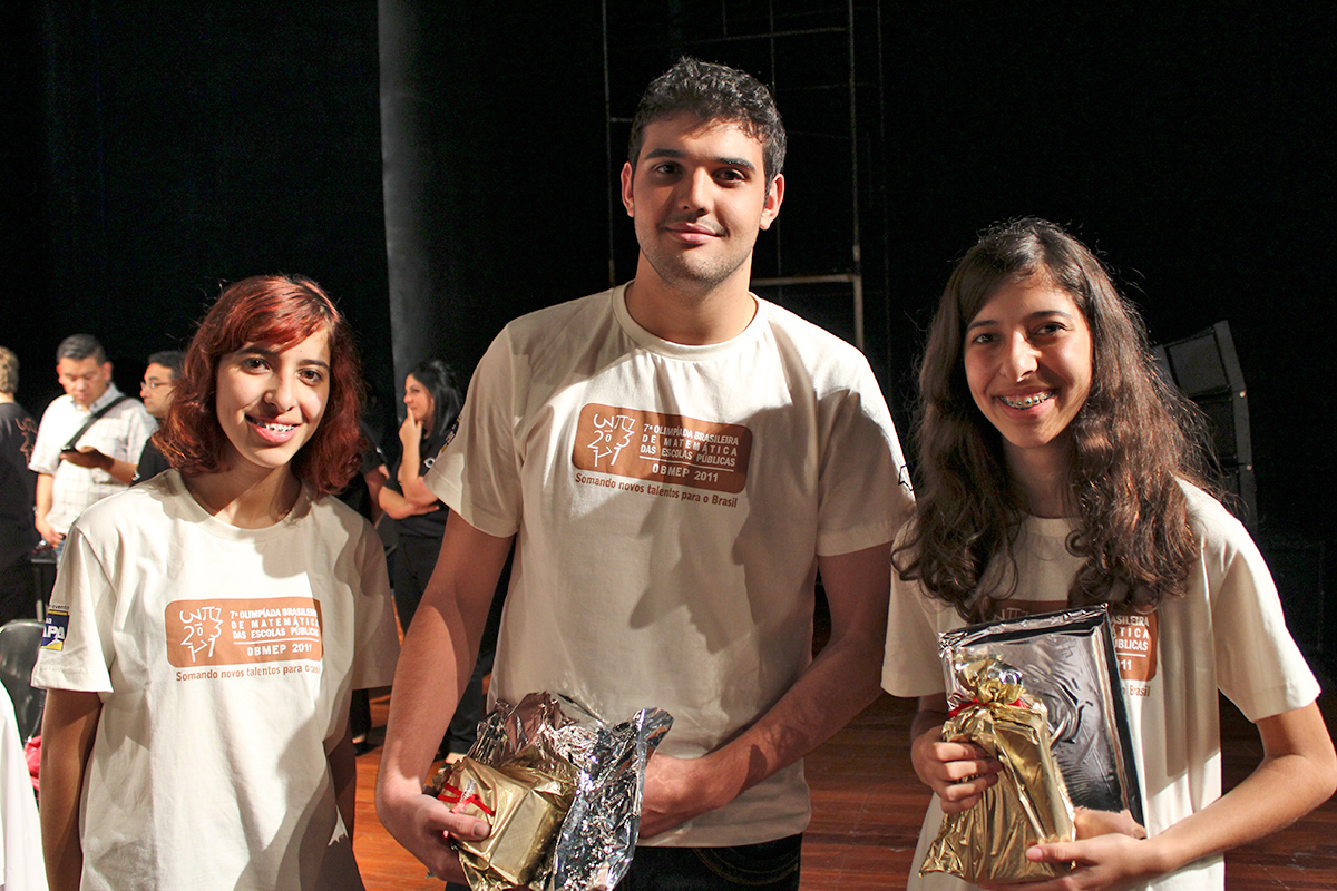 Leandro Mauri, da Escola Técnica Estadual (Etec) Profa. Anna de Oliveira Ferraz, de Araraquara, e as irmãs gêmeas Marisa e Marli Cantarino, ambas da Etec Júlio de Mesquita, de Santo André, receberam as medalhas de ouro conquistadas na 7ª Olimpíada Brasileira de Matemática das Escolas Públicas (OBMEP) no Rio de Janeiro.