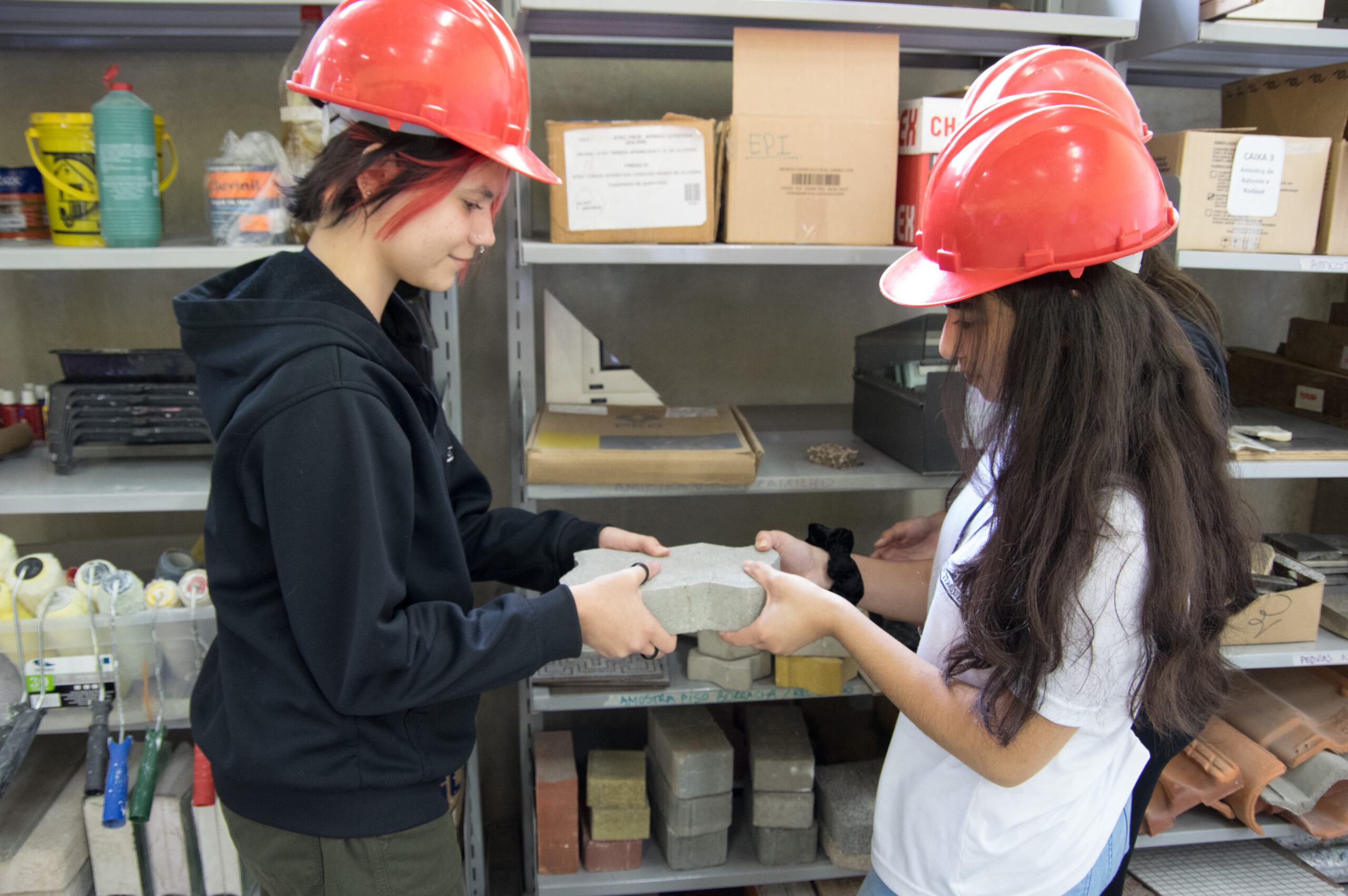 Alunas do curso de Edificações, da Etec Itaquera II, analisam materiais de construção durante atividade em aula prática | Foto: Roberto Sungi