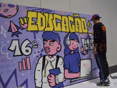 O artista paulistano participou da feira durante dois dias, imprimindo seu traço já conhecido dos paulistanos e enaltecendo a educação