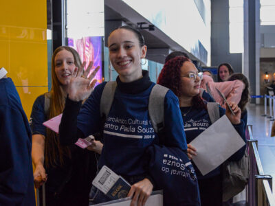 O diretor-superintendente do CPS, Clóvis Dias, e o vice, Maycon Geres, se despediram de alunos e monitores que viajaram para Inglaterra, Irlanda, EUA e Argentina