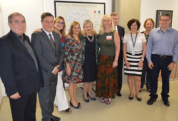 A diretora-superintendente do Centro Paula Souza, Laura Laganá, recebeu nesta terça-feira, 8, a diretora de parcerias internacionais da St. Bonaventure University (SBU), Kathryn Baugher, e o diretor de pós-graduação, Bruce Campbell. Durante o encontro, foram discutidas possibilidades de cooperação entre o instituto norte-americano e as Faculdades de Tecnologia do Estado (Fatecs).