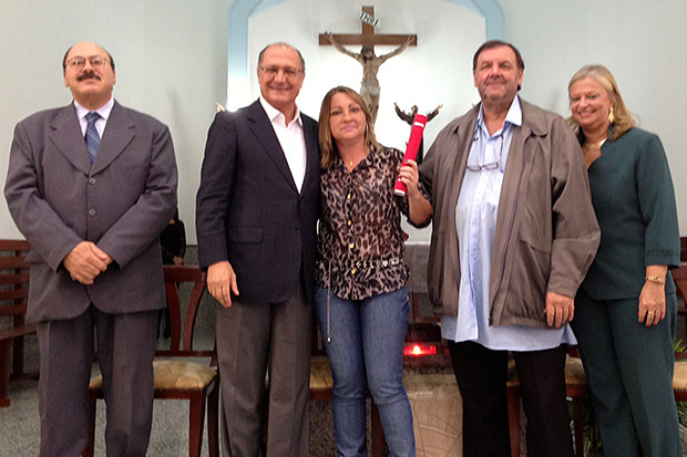 A aluna Jeane Mariz recebe o diploma das mãos do governador Geraldo Alckmin; com ele o secretário Luiz Carlos Quadrelli, Padre Ticão e a superintendente do Centro Paula Souza, Laura Laganá