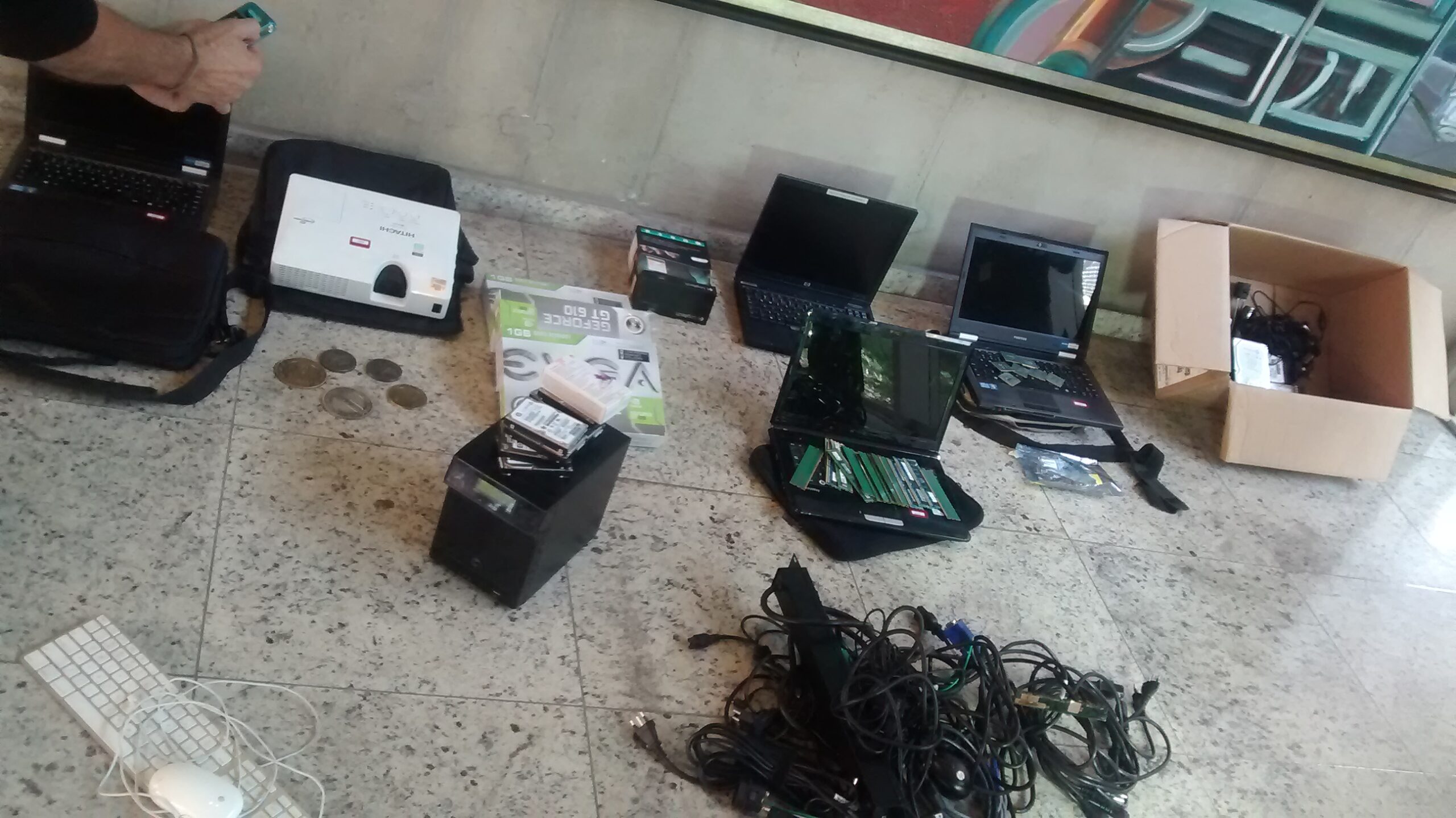 Poucas horas depois da reintegração de posse, na sexta-feira, 6, a polícia devolveu ao Centro Paula Souza 4 notebooks, 15 pentes de memória, 1 projetor, 5 webcams e 3 placas de vídeo, entre outros itens, que não constam do BO de hoje. Ocupantes foram presos em flagrante com equipamentos retirados do prédio.