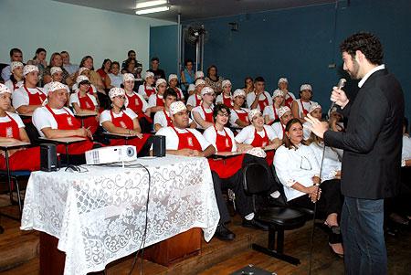 “Quem aqui quer ser chefe de cozinha?” Diante das mãos levantadas dos alunos, Oliveira desmistificou a profissão. “Depois de 12, 14 horas de calor, estresse, adrenalina, os cozinheiros dizem que isso é o pior do trabalho. Mas no dia seguinte, pode perguntar o melhor: o calor, o estresse, a adrenalina”. O chefe de cozinha ensinou a técnica correta de fritura do torresmo – especialidade do restaurante Mocotó – e lembrou à turma que ser celebridade não significa cozinhar bem. “Há grandes chefes que não são excelentes cozinheiros. Um chefe de cozinha deve ser líder e saber gerir a equipe”.