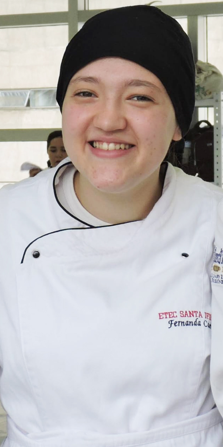 Na Etec Santa Ifigênia, os alunos do curso de Gastronomia são bastante engajados com a possibilidade de empreender. Fernanda Campos está no segundo ano e, desde 2023, divide as tarefas com a mãe, que é proprietária da confeitaria Bolos da Josi, na cidade de Guarulhos.