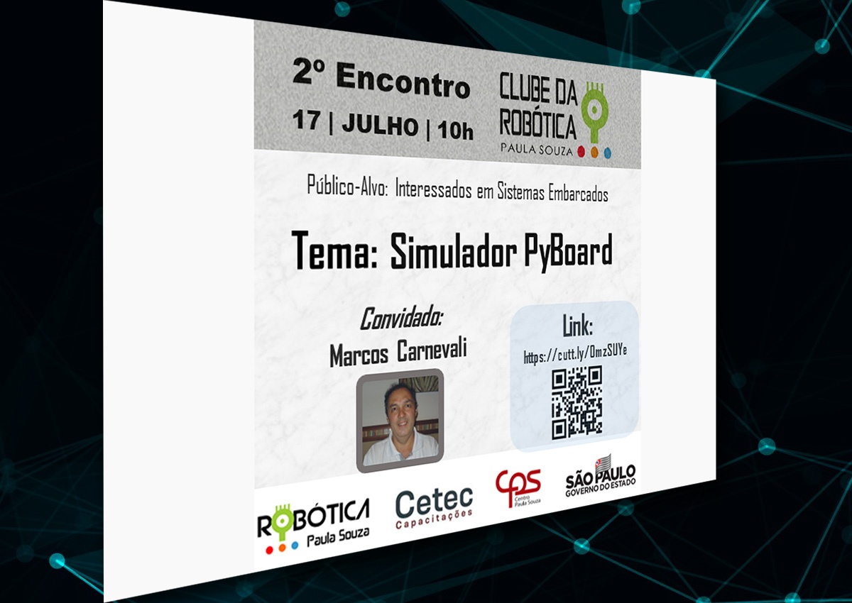 Neste sábado (17), a partir das 10 horas, será realizado o segundo encontro do Clube da Robótica do Centro Paula Souza (CPS), que terá como tema Simulador PyBoard e as vantagens da plataforma virtual gratuita para o aprendizado de robótica. O sistema utiliza linguagem simples e interface de fácil navegação para auxiliar professores e alunos na aplicação de recursos de sistemas embarcados para o desenvolvimento de projetos. A palestra online será apresentada pelo professor Marcos Carnevali, da Escola Técnica Estadual (Etec) Dep. Ary de Camargo Pedroso, de Piracicaba, e poderá ser acompanhada abertamente pelo Microsoft Teams.