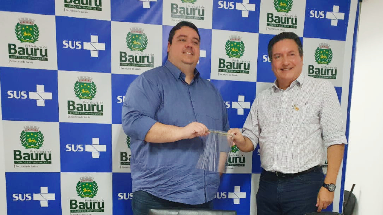 Diretor da Secretaria Municipal de Saúde de Bauru (esq.) recebe EPIs doados pelo diretor da Fatec | Foto: Divulgação