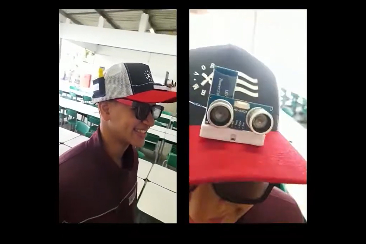 Resumo: trata-se de um dispositivo eletrônico acoplado a um boné que emite um sinal sonoro ao identificar obstáculos na altura da cabeça do usuário. O projeto é voltado à segurança e acessibilidade para pessoas com deficiência visual.