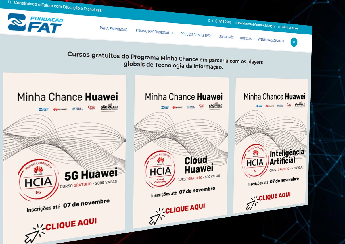 Estão abertas as inscrições para 3 mil vagas em cursos online gratuitos de qualificação em tecnologia 5G, computação em nuvem e inteligência artificial (IA), oferecidos pelo Centro Paula Souza (CPS) em parceria com a Huawei e a Secretaria de Desenvolvimento Econômico, Ciência e Tecnologia do Estado de São Paulo (SDE), por intermédio do programa Minha Chance. A iniciativa pretende preparar profissionais capacitados em soluções digitais para o mundo do trabalho. Os interessados em participar do teste de seleção online devem fazer a inscrição até 7 de novembro pelo site fundacaofat.org.br.