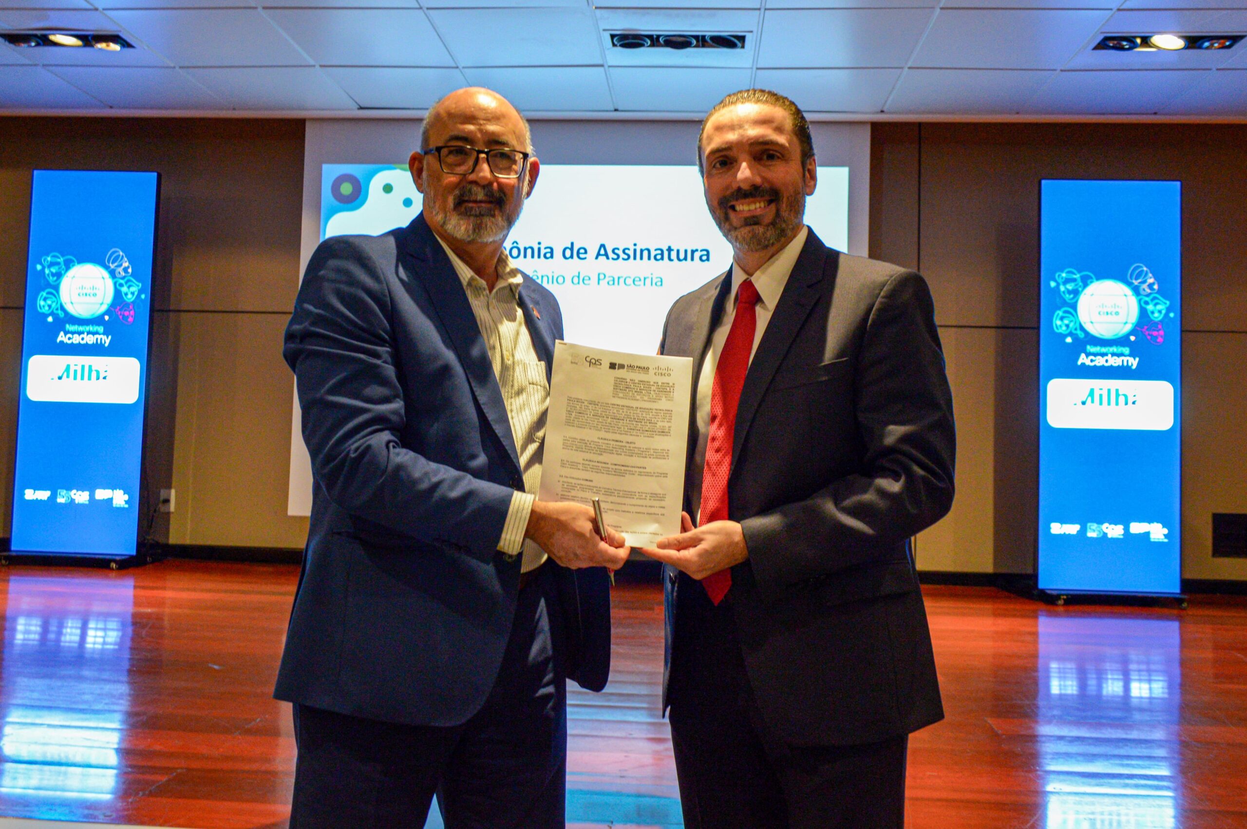Diretor-superintendente do CPS, Clóvis Dias, e presidente da Cisco, Ricardo Mucci, celebraram assinatura de novo acordo l Foto: Roberto Sungi