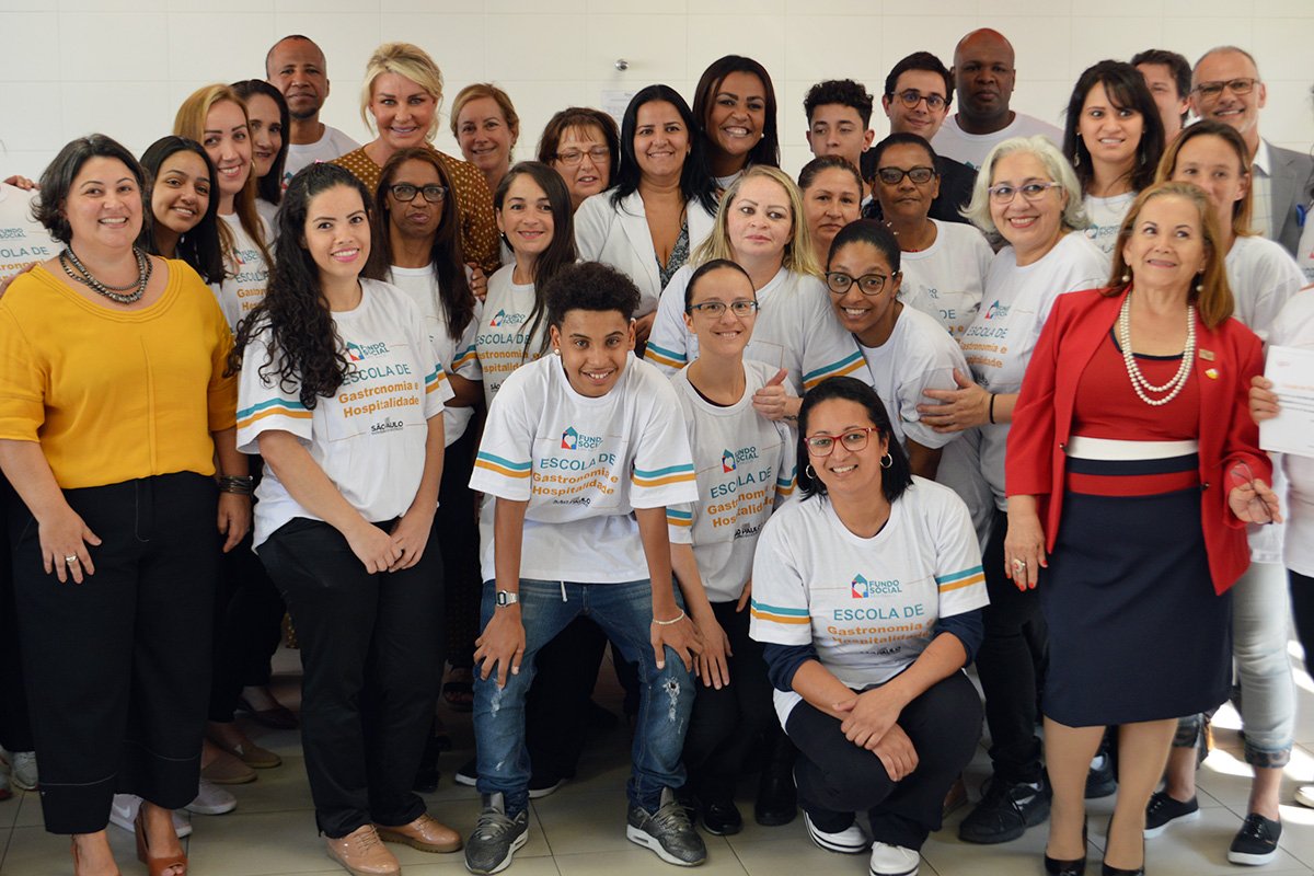 A Primeira-Dama e Presidente do Fundo Social de São Paulo, Bia Doria, e a vice-diretora-superintendente do Centro Paula Souza (CPS), Emilena Lorenzon Bianco, participaram nesta sexta-feira (25) da cerimônia de encerramento das primeiras turmas dos cursos de qualificação profissional de Salgadeiro e de Organização de Eventos oferecidos na Escola Técnica Estadual (Etec) Santa Ifigênia por intermédio do programa Escolas de Qualificação Profissional, promovido pelo Fundo Social em parceria com o CPS.