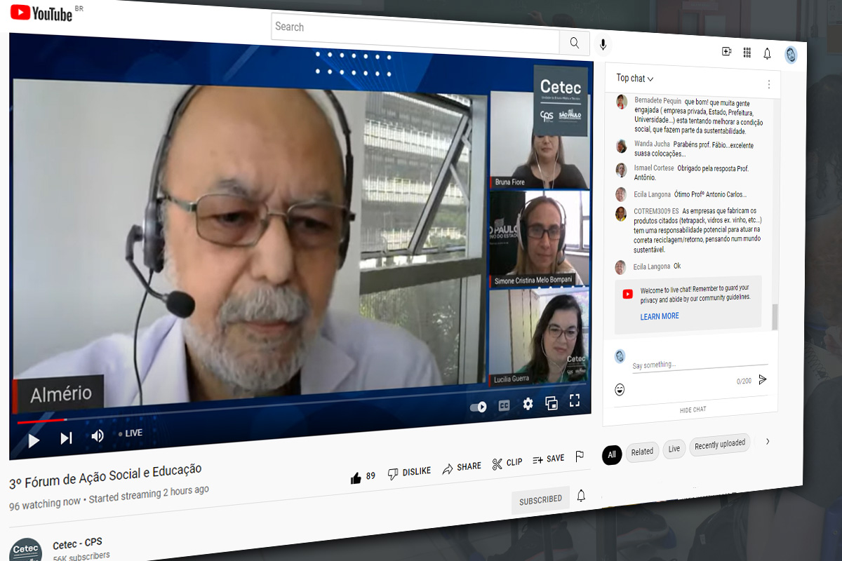 Com objetivo de debater ações para fortalecer o papel social da escola, o Centro Paula Souza (CPS) realizou na tarde desta quinta-feira (24), a terceira edição do Fórum de Ação Social e Educação. O evento online reuniu professores, gestores e supervisores de Escolas Técnicas (Etecs) e Faculdades de Tecnologia estaduais (Fatecs) focados em estimular a formação cidadã nas práticas educativas, de acordo com os Objetivos de Desenvolvimento Sustentável (ODS) da Organização das Nações Unidas (ONU). A transmissão foi feita ao vivo pelo canal da Unidade do Ensino Médio e Técnico (Cetec) do CPS no Youtube.
