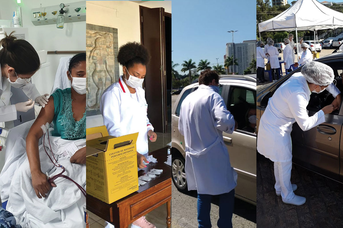 A partir da esquerda, estudantes e professores imunizam população em Matão, Batatais, Barueri e Atibaia l Foto: Montagem/divulgação