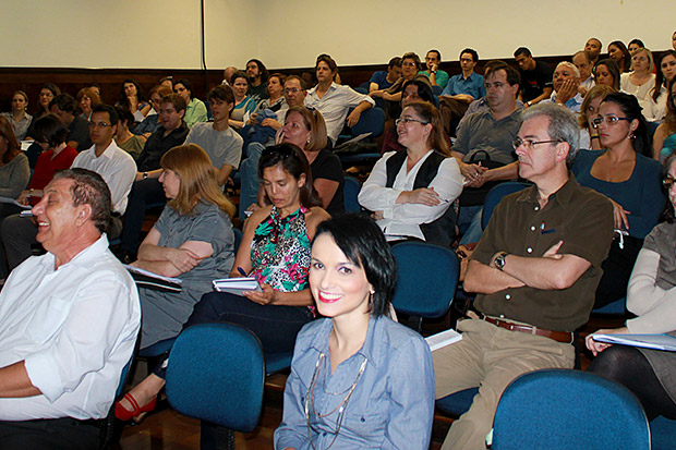 Fernanda Demai, organizadora do evento (ao centro), e professores na plateia