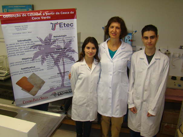 O projeto Obtenção de Celulose a partir da Casca do Coco Verde – orientado pela professora Célia Abud – concorreu com 27 trabalhos na modalidade química nível médio. Além de certificado, os alunos serão premiados com R$ 10 mil em dinheiro. A orientadora receberá R$ 4,6 mil. A cerimônia de entrega da premiação será em setembro na sede do Conselho, em São Paulo.