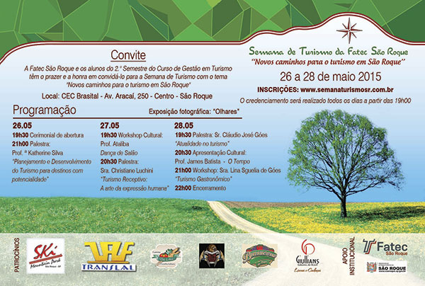 Novos Caminhos para o Turismo no município é o tema da primeira Semana de Turismo da Faculdade de Tecnologia do Estado (Fatec) São Roque. Organizado pelos alunos do segundo semestre do curso de Tecnologia em Gestão de Turismo, o evento começa hoje e segue até quinta-feira, 28 de maio. Interessados podem fazer sua inscrição gratuitamente pela internet.