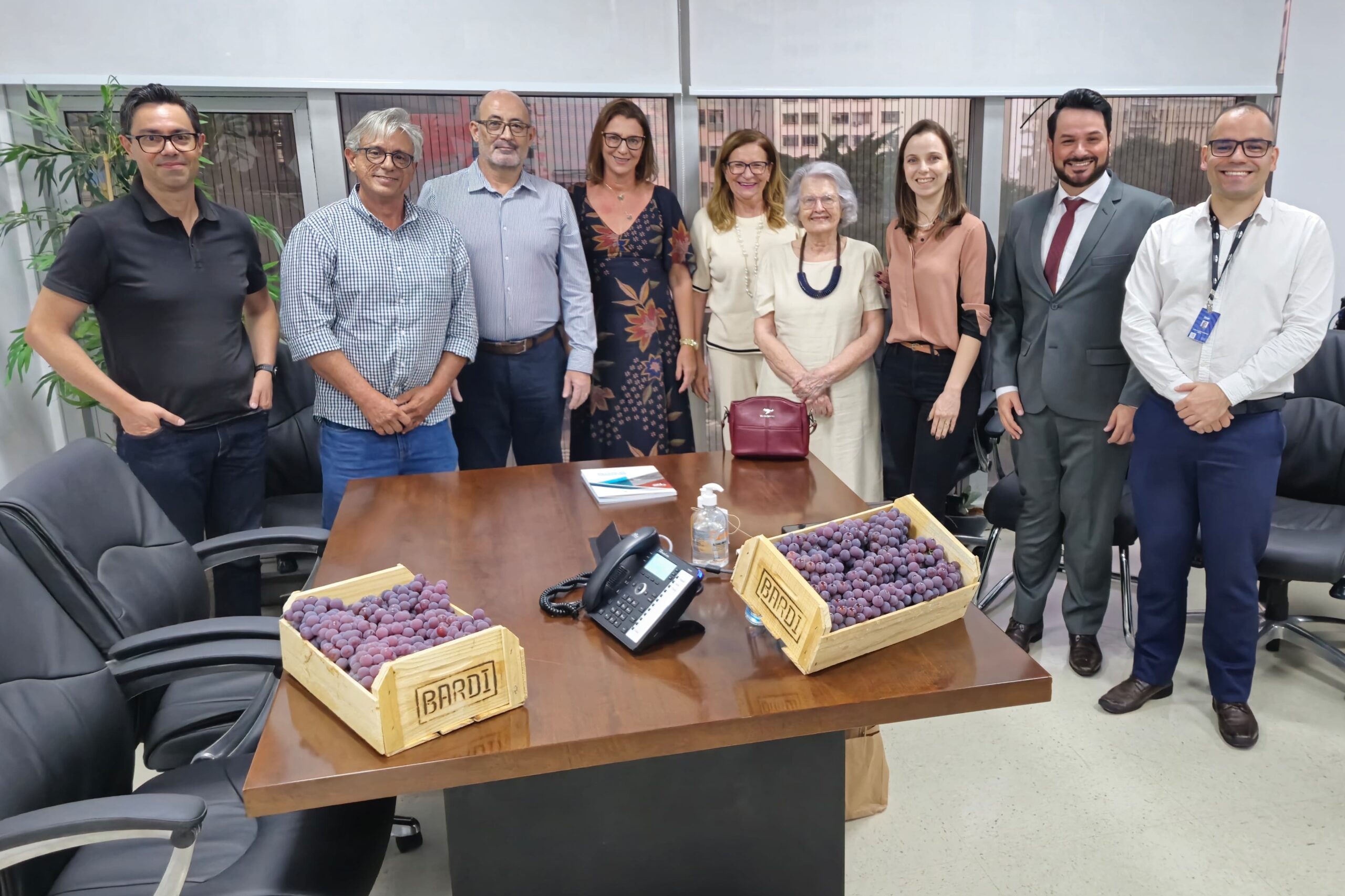 O diretor-superintendente do Centro Paula Souza (CPS), Clóvis Dias, e o vice, Maycon Geres, receberam, na Administração Central da instituição, na Capital, uma comitiva de representantes e incentivadores do curso de Viticultura. Estiveram presentes Eduardo Alvarez; Adilson Amatto, responsável pelo projeto dos vinhedos; Veronica Pavan e Esmeralda Serpa, responsáveis pelos currículos do curso técnico de Viticultura e Enologia; Fabiana Lourençon Moraes, diretora da Etec; Paola Tedeschi, diretora do Italian Culinary Institute for Foreigners (Icif) no Brasil; e os assessores do deputado estadual Lucas Bove, Luan Viana e Eduardo Soares de Camargo.