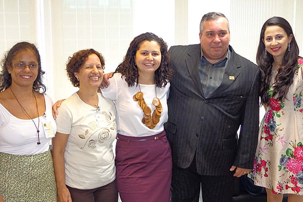 da esquerda para a direita: Sandra (moradora da Aldeia Jaraguá), Maria Sueli Fonseca Gonçalves (Projeto Academia Estudantil de Letras – DRE Penha), Silvia da Silva Craveiro, Ricardo Freire e Erika Caracho Ribeiro (Etec CEPAM). / Etec Cepam
