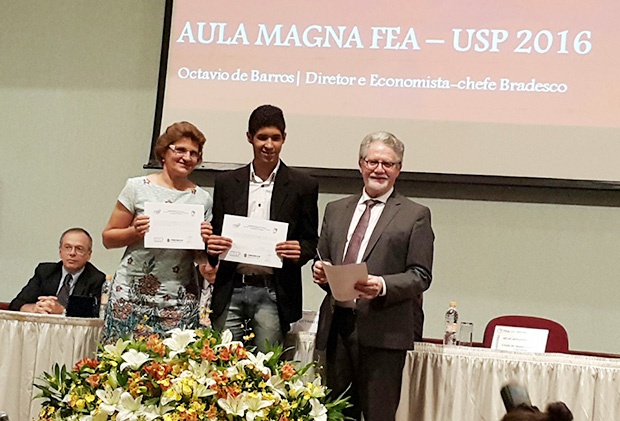 Crédito: Divulgação | Ao lado da professora Izabel Gil, aluno Guilherme Augusto Santana (centro) exibe prêmio recebido durante aula magna dos cursos de graduação da FEA-USP