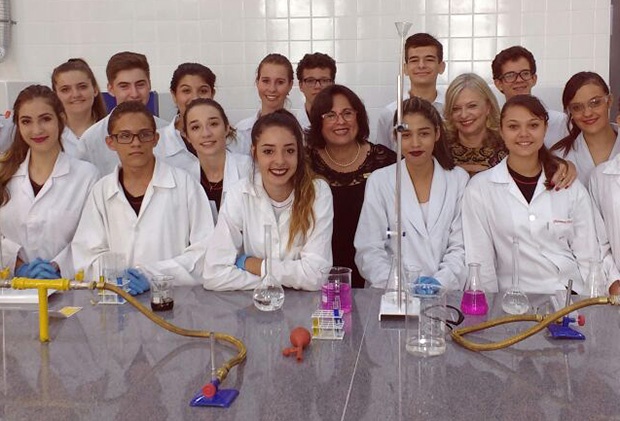 Crédito: Kazumi Takaesu | Ao lado da diretora da Etec João Belarmino, Cleusa Albuquerque (centro), Laura Laganá (dir.) visitou o laboratório com os alunos do curso técnico de Química integrado ao Ensino Médio