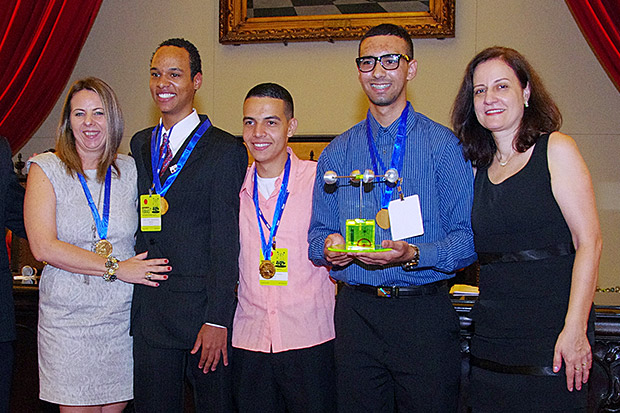 Etec Lauro Gomes, de São Bernardo: alunos Gustavo Henrique Bracco e Lais Cassaro, orientadora Malu Machado, e Irene Ficheman da Febrace