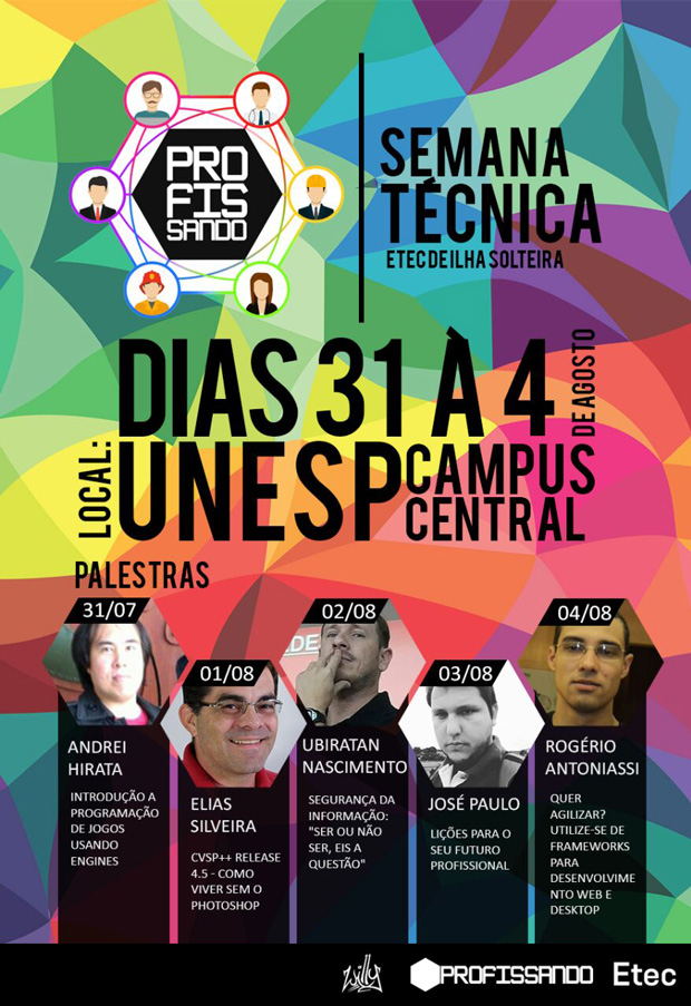 Na quinta-feira, dia 3, José Paulo Codinhoto convida os alunos para refletirem com Lições Para o Seu Futuro Profissional. E na sexta-feira, dia 4, Rogério Antoniassi encerra a semana com o tema Quer Agilizar? Utilize-se de Frameworks para Desenvolvimento Web e Desktop. As palestras serão realizadas na Universidade Estadual Paulista (Unesp) – campus central de Ilha Solteira.