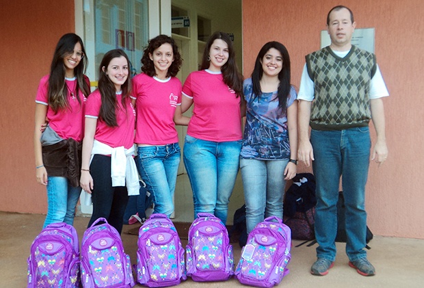 Crédito: Divulgação | Alunas Mayara, Laura, Clara e Emilly, com a monitora Maressa Rodrigues e o professor André Angelis