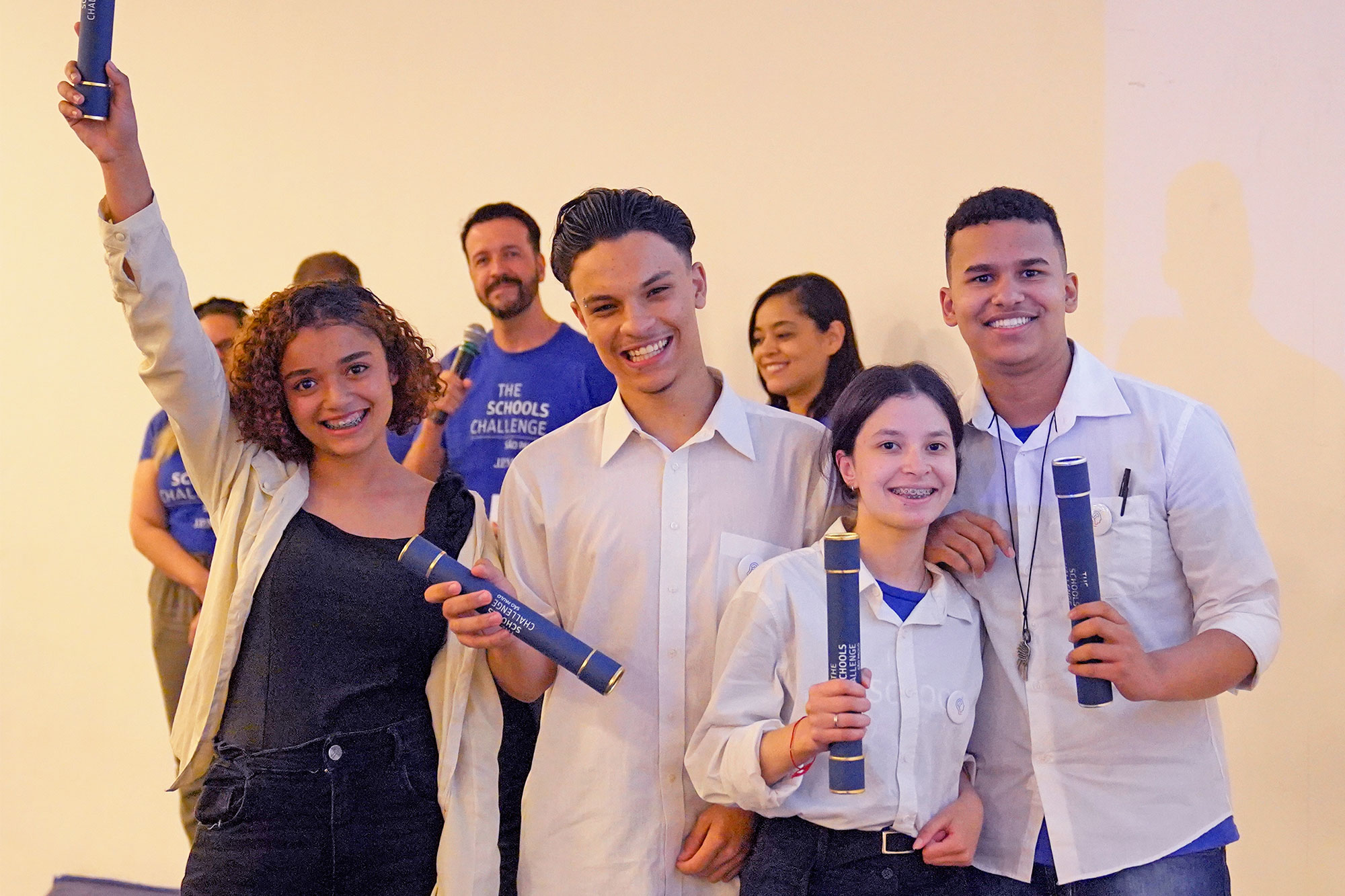 Os vencedores: da esquerda para a direita, Giovvana, Victor Hugo, Nicoly e Andrey | Foto: Divulgação The Schools Challenge São Paulo