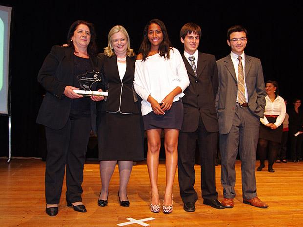 Professora Angela (primeira à esquerda) e Gabriel (de óculos, à direita), na premiação do 1.º Benchmarkin Junior, em agosto, embarcam nesta segunda. / Divulgação.
