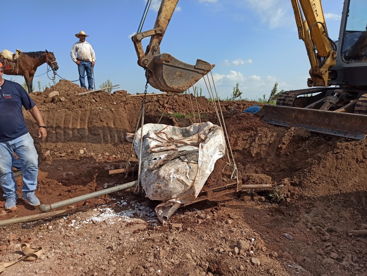 Encontrado em 2013 por uma equipe da Universidade Federal do Rio de Janeiro (UFRJ), o fóssil de dinossauro saurópode não pôde ser retirado na época devido à falta de de verba. Entre os dias 22 de janeiro e 6 de fevereiro, os ventos começaram a mudar: a Etec serviu de base de alojamento para pesquisadores e paleontólogos da Universidade do Estado do Rio de Janeiro (UERJ), agora no comando da missão, prontos para içar o fragmento graças à verba liberada pela aprovação do projeto em edital do Conselho Nacional de Desenvolvimento Científico e Tecnológico (CNPq). O período chuvoso, porém, concorreu para o adiamento da empreitada. Para preservar a peça, pesquisadores e alunos, sob a coordenação do professor André Piacentini Pinheiro, do Campus de São Gonçalo, da UERJ, a revestiram com gesso. Finalmente, no dia 14 de fevereiro, a operação pôde ser concluída. Ao menos em parte.