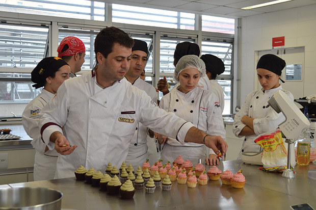 Alunos do terceiro módulo do curso técnico de Cozinha da Escola Técnica Estadual (Etec) Santa Ifigênia receberam nesta quarta-feira, 17, a visita do chef Rafael Mosca para conhecer novas possibilidades no mundo da confeitaria.