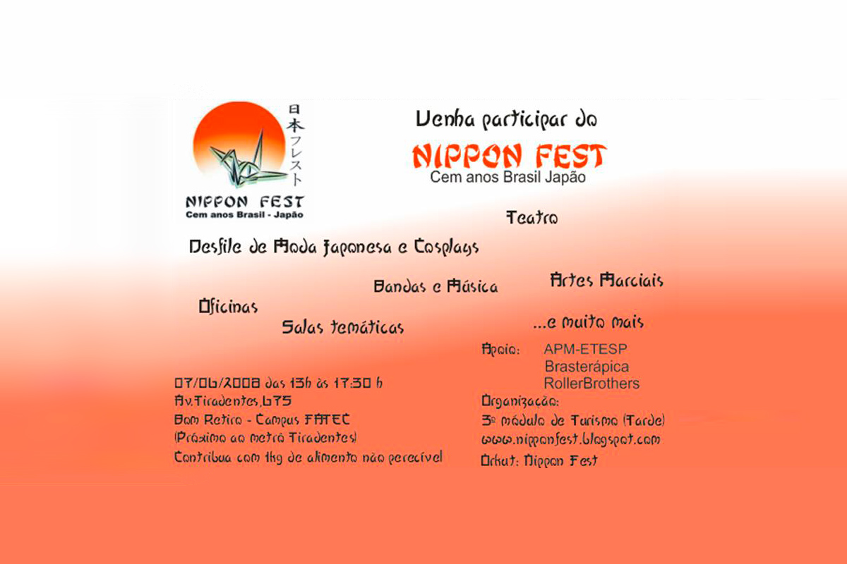 Para comemorar o centenário da imigração japonesa no Brasil, alunos do curso de Turismo da Escola Técnica (Etec) São Paulo promovem neste sábado, 7, a partir das 13 horas, o Nippon Fest, com apresentações de teatro, artes marciais e bandas, desfile de moda japonesa e cosplays – pessoas que se fantasiam de personagens de revista em quadrinhos e desenhos japoneses -, oficinas de Origami, Shiatsu, língua japonesa, entre outras atrações.