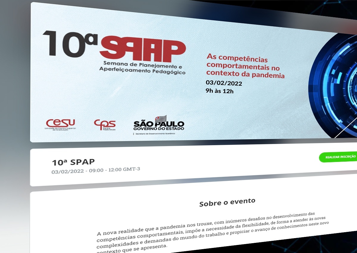 Começa nesta quarta-feira (2) a décima edição da Semana de Planejamento e Aperfeiçoamento Pedagógico (SPAP) das Faculdades de Tecnologia do Estado (Fatecs). Organizado pela Unidade do Ensino Superior de Graduação (Cesu), do Centro Paula Souza (CPS), o evento tem duração de dois dias e reunirá professores, coordenadores de curso e diretores para debater o tema As competências comportamentais no contexto da pós-pandemia.