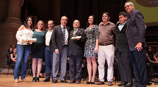 Crédito: Divulgação | Equipe vencedora recebe o prêmio na Sala São Paulo