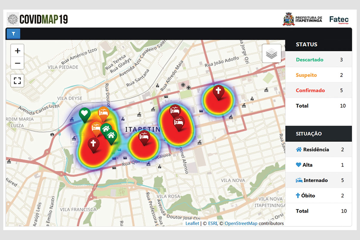 A Faculdade de Tecnologia do Estado (Fatec) Prof. Antônio Belizandro Barbosa Rezende, de Itapetininga, em parceria com a prefeitura da cidade, desenvolveu um mapa digital das ruas e bairros do município, com informações sobre as áreas mais afetadas pela pandemia. Com poucos casos confirmados de contaminação pelo novo coronavírus até o momento, a Vigilância Epidemiológica Municipal agiu rápido e, de forma preventiva, solicitou à Fatec o desenvolvimento de uma ferramenta para monitorar as áreas. Desenvolvida em duas semanas, a plataforma foi batizada de COVIDMAP19 e começou a ser usada no dia 7 de abril.