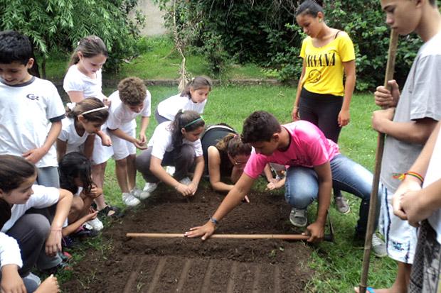 Alunos da Etec de Garça Alexsandro Tachinski (blusa rosa) e Michele Oliveira (blusa amarela) ensinam práticas agrícolas em escola uruguaia. / Foto – Divulgação.