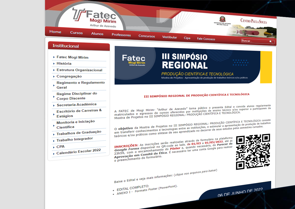 A Faculdade de Tecnologia do Estado (Fatec) Mogi Mirim prorrogou as inscrições para o 3º Simpósio Regional: Produção Científica e Tecnológica. Estudantes e professores das Escolas Técnicas Estaduais (Etecs), Fatecs e demais instituições de Ensino Técnico, Médio, de tempo integral e Superior têm até dia 8 de maio para submeter seus trabalhos exclusivamente pela internet.
