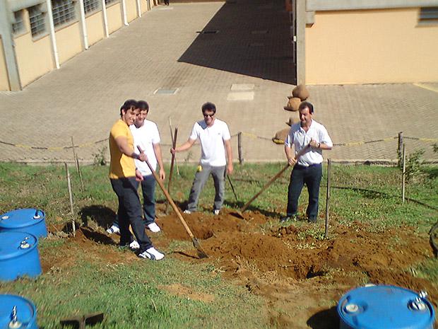 Estudantes trabalham com biodigestores da faculdade. / Foto – Divulgação.
