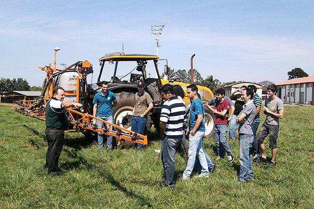 Alunos da Fatec Pompeia durante aula de calibragem de pulverizador. / Fatec