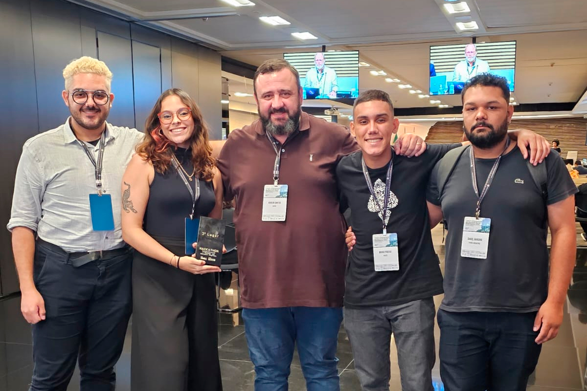 Robson Santos (centro), junto aos alunos Caio, Ruth, Bruno e Daniel: trabalho premiado na Fiesp e exposto na HubTec | Foto: Divulgação