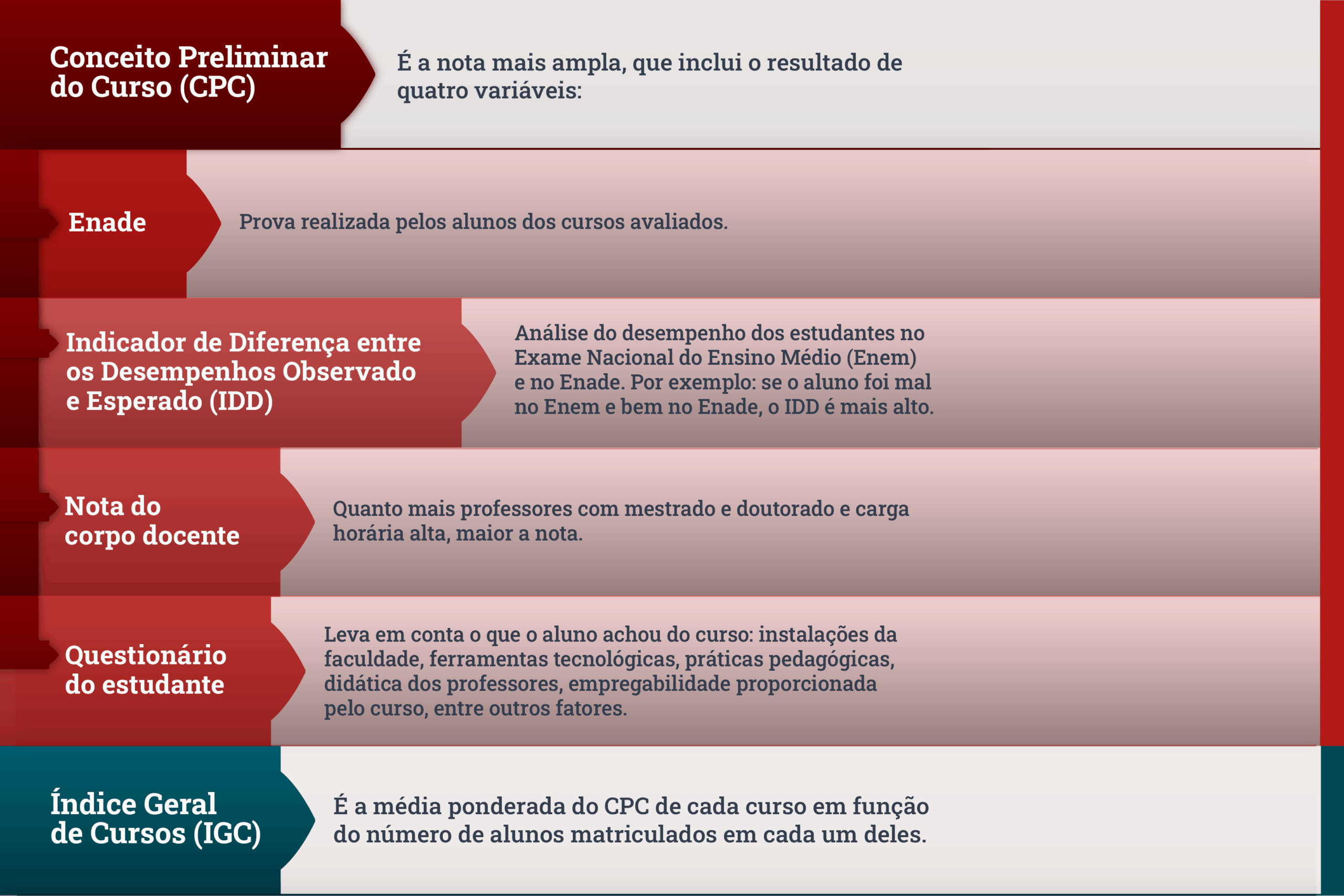 O CPC é obtido a partir de uma equação que considera a nota dos alunos no Enade, o Indicador de Diferença entre os Desempenhos Observado e Esperado (IDD), a nota do corpo docente e o questionário respondido pelos estudantes (veja abaixo).