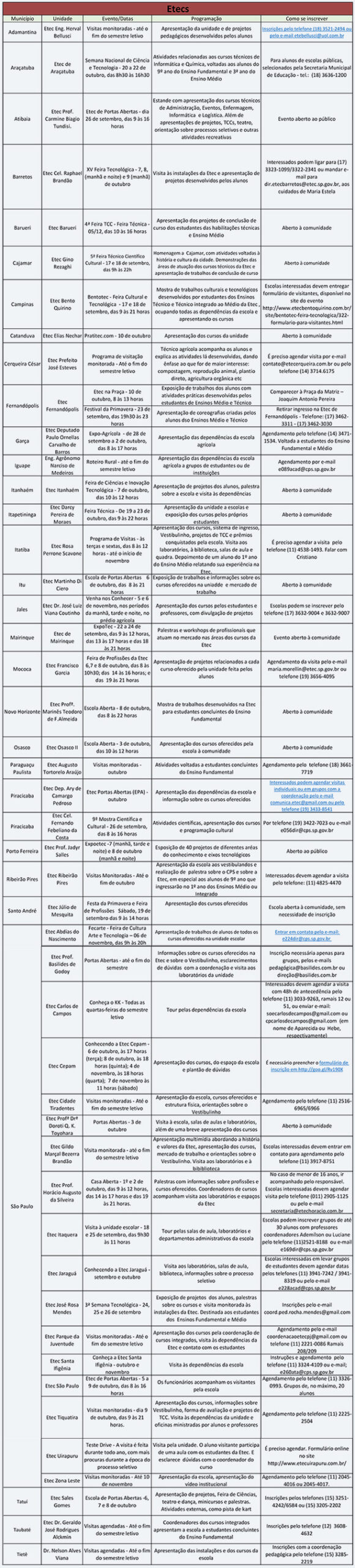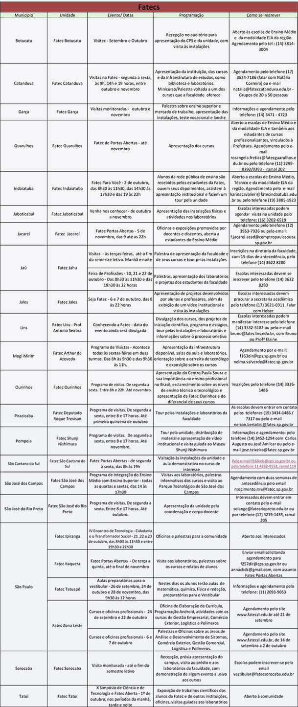 As Faculdades de Tecnologia (Fatecs) e as Escolas Técnicas (Etecs) estaduais abrem suas portas neste segundo semestre para apresentar seus cursos e mostrar os trabalhos elaborados por seus estudantes a toda a comunidade do município e região. A iniciativa é voltada aos alunos concluintes dos Ensinos Fundamental e Médio, regular ou EJA, e também aos interessados em participar dos processos seletivos – Vestibular e Vestibulinho – para dar continuidade aos estudos ou ingressar em um curso técnico ou superior tecnológico em 2016.